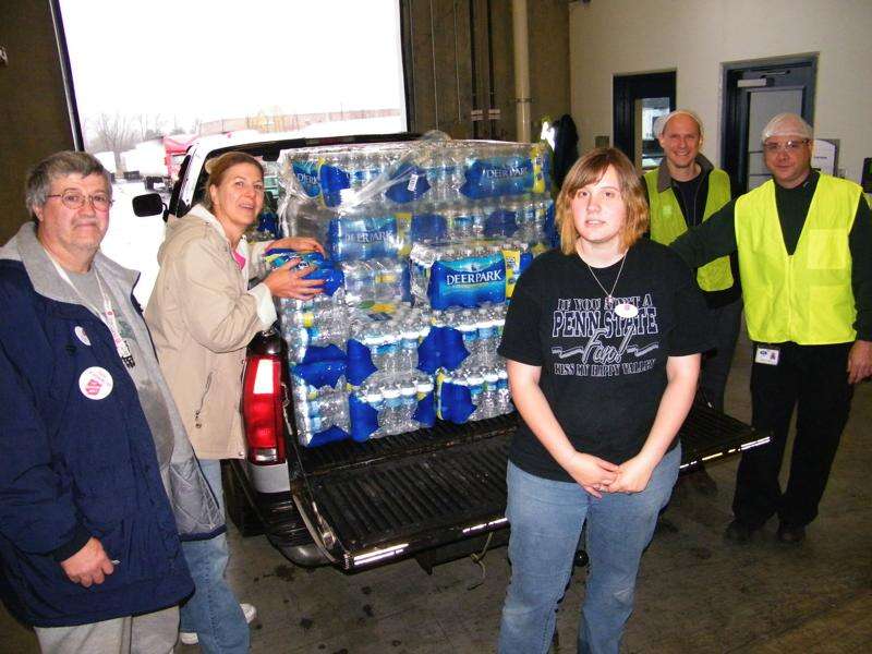 Nestle Waters in Breinigsville (near Fogelsville) donated almost 4,000 bottles of Deer Park spring water to the Tamaqua Salvation Army in support of their holiday and daily food distribution. Eastern Pennsylvania's American Legion Auxiliary Veterans Affairs Training and Rehabilitation Representative Pat Clemens, from Tamaqua, helped organize the large contribution with Nestle Waters. Salvation Army volunteers made three trips with their trucks to pick up the donations. Pictured from left, are Tamaqua Salvation Army volunteer and soldier Jesse Durning, organizer Pat Clemens, Tamaqua Salvation Army volunteer and soldier Mel Latham, Nestle Waters line technician Joe Duffy, and Nestle Waters Warehouse Coordinator Bill Hettrick, from Lansford.
