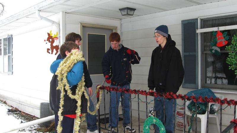 Boy Scout Troop 555, Penn Forest Township, decorated the Rau Personal Care Home for the holidays again this year. Scouts included, from left, Chris Miller holding the garland; his brother Tim Miller, standing behind him; Adam Dachowicz with the lights, and Steven Hutta on the porch.
