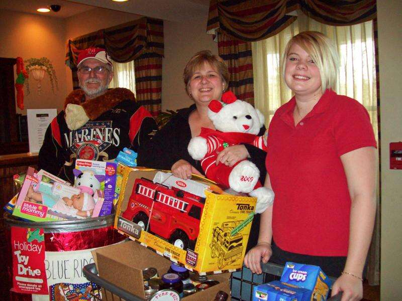 Country Inn and Suites, Route 209, Interchange Road, Lehighton, held "Christmas in the Country" event on Saturday and Sunday to collect toys, food and funds for the Carbon-Mountaineers Marine Corps League Detachment 996 Blue Ridge Toy and Food Drive. The event raised $733 and a full barrel of toys and several boxes filled with nonperishable foods for food baskets. From left are, Nick Hawkey, representing the Carbon-Mountaineers MCL; and Cheryl Haas and Kelly Neff of County Inn and Suites.