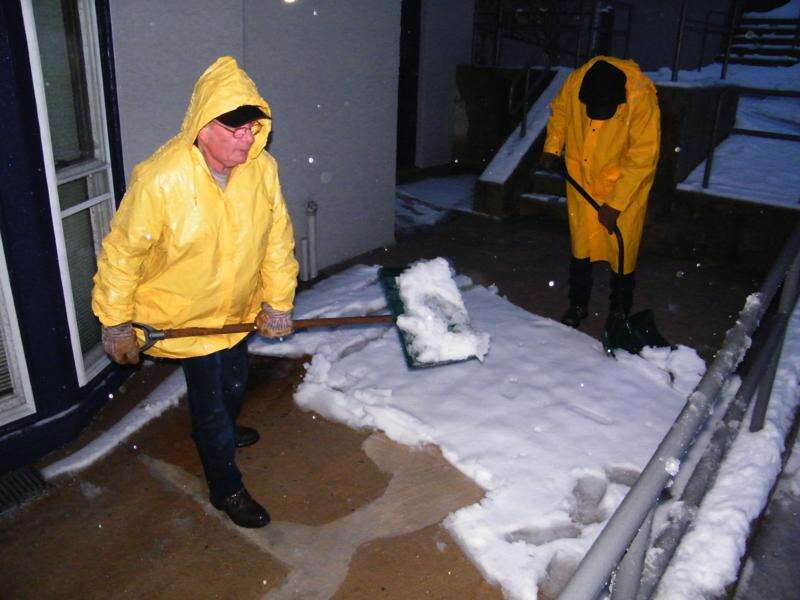 Tamaqua School District employees Ron Mace, left, and Jack Swartz, shovel snow outside the Tamaqua School District Administration Building. The entire district was on a two-hour delay this morning because of the overnight snowstorm.