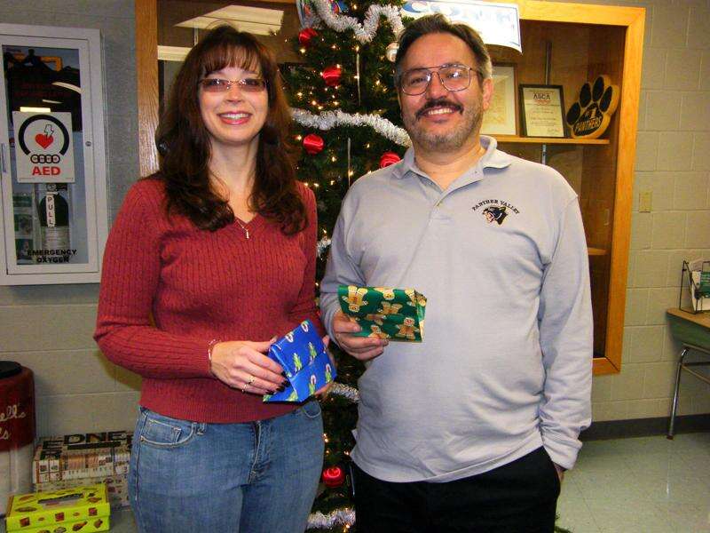 The Nesquehoning Woman's Club donated 50 pair of mittens to needy students at the Panther Valley Elementary School for Christmas. Seen presenting the wrapped mittens to PVES principal, Bill Lombardo is Maureen Novy from the NWC.