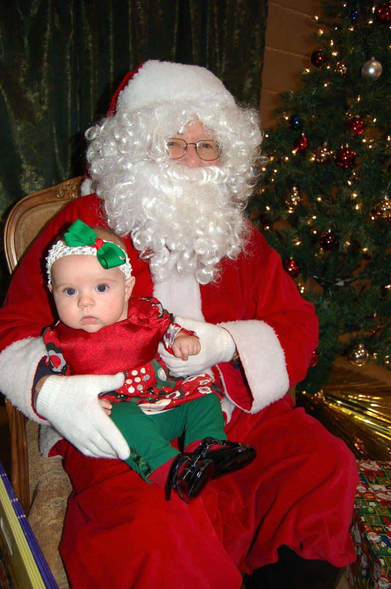 Gail Maholick/TIMES NEWS Stella Breiner, 4 months, and daughter of Ernie and Jordie Breiner of Lehighton is the pretty miss meeting Santa Claus for the first time. She was one of the 75 children attending the Breakfast with Santa, sponsored by the Lehighton Area Lioness Lions Club.