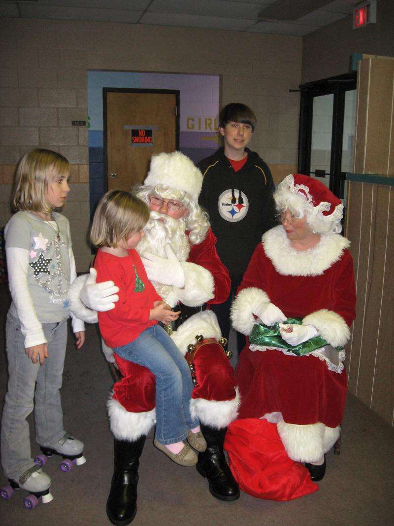 Siblings Emily, 8, Hannah, 4, and Tyler Devonshire, 14, gather around Santa and Mrs. Claus at Jim Thorpe Memorial Park's skating rink. Jim Thorpe Scouts gathered this weekend to meet Santa Claus and celebrate the end of another year with their Scouting friends and families. Boy Scouts, Cub Scouts and Girl Scouts of all ages attended. Each Scout was asked to bring a toy to donate to Toys for Tots to make a less fortunate child's holiday brighter, and they donated more than 60 toys. Santa and Mrs. Claus were played by Boy Scout Troup 555 leader Ray Attewell and Girl Scout Troop 4229 volunteer Rose Eberts. The event was sponsored by Boy Scout Troop 555, Cub Pack 567, and Girl Scout Troop 4229.