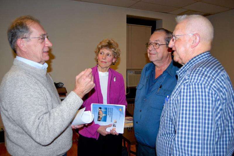 RON GOWER/TIMES NEWS John Wieczoek, left, Mahoning Township supervisor, discusses the potential of forming a Council of Government in Lower Carbon County with, l-r, Linda Costa, executive director of the Pa. Association of Councils of Government; Ernest Guldner, representing Bowmanstown Borough Council, and Grant Hunsicker, president of Lehighton Borough Council. Nine municipalities were represented at the meeting, held in the Lehighton Municipal Building.