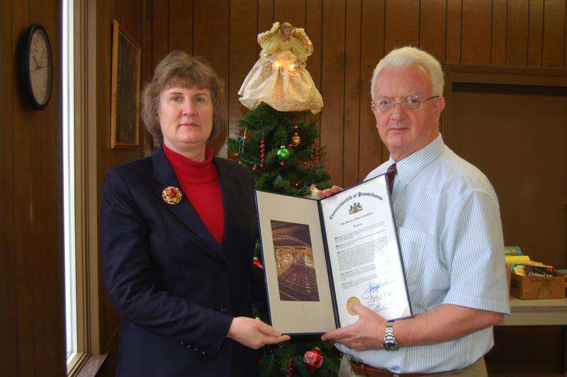 State Representative Jerry Knowles presents a citation to Gayle Heath, director of the Tamaqua Public Library, on behalf of the Pennsylvania General Assembly in honor of the library's 75th anniversary. The library is located on South Railroad Street in Tamaqua.