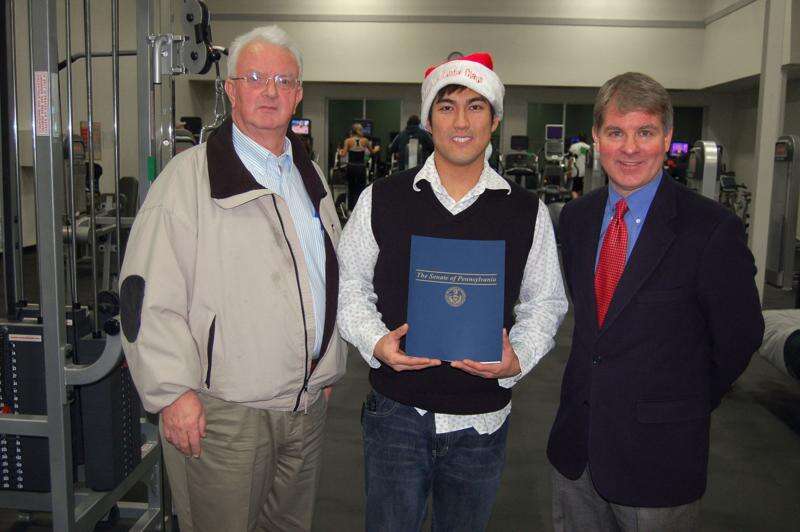 The Tamaqua YMCA celebrated the one-year anniversary of its new family fitness center, located in the former Jamesway Department Store, with a Christmas party and open house on Friday, Dec. 18 at the facility. Among the well-wishers in attendance were State Representative Jerry Knowles (R-124, left) and State Senator David Argall (R-29, right). Argall presented a citation to the Tamaqua YMCA on behalf of the State Senate. Accepting for the Tamaqua Y was Nick Zigmant (center), branch executive.