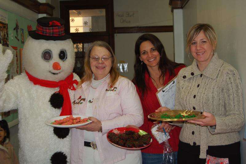LINDA KOEHLER/TIMES NEWS Frosty the Snowman, Noraine (Grandma) McGee of Grandma's Bakery and Cafe, (cookie judge) Lori Malsch, SS Peter and Paul School volunteer and Lisa Palfey of sugarlily cookie company (cookie judge) thought the entries for the school's Christmas Festival's Cookie Contest not only looked great but tasted delicious.
