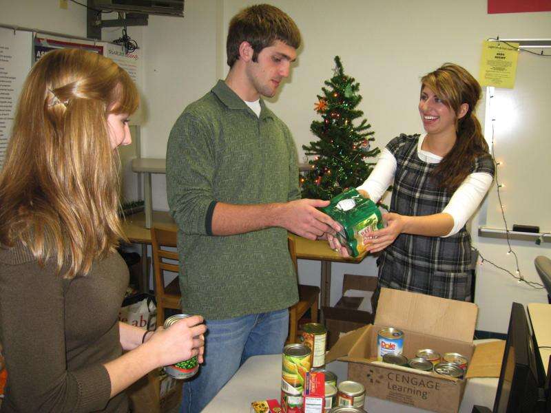 Students and faculty at Lehighton Area High School donated more than 250 cans and boxes of food during their annual holiday food drive, organized by members of the school's National Honor Society. Members of the honor society visited homerooms each morning to request donations. These food items will be distributed to needy families in the area through the Trinity Food Pantry in Lehighton. The school also collected items for Toys for Tots, breaking their previous record for toys gathered despite hard economic times. From left, Jennifer Everett, Tim Sulzer, and Molly Harleman package donations before bringing them to the food pantry.