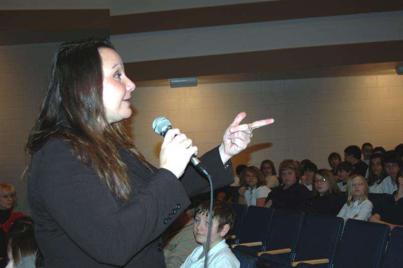 DONALD R. SERFASS/TIMES NEWS Janene Holter of the state Attorney General's Office, interacts with students Friday in the Tamaqua Area Auditorium. Holter warned the students against improper use of cyberspace and technology.