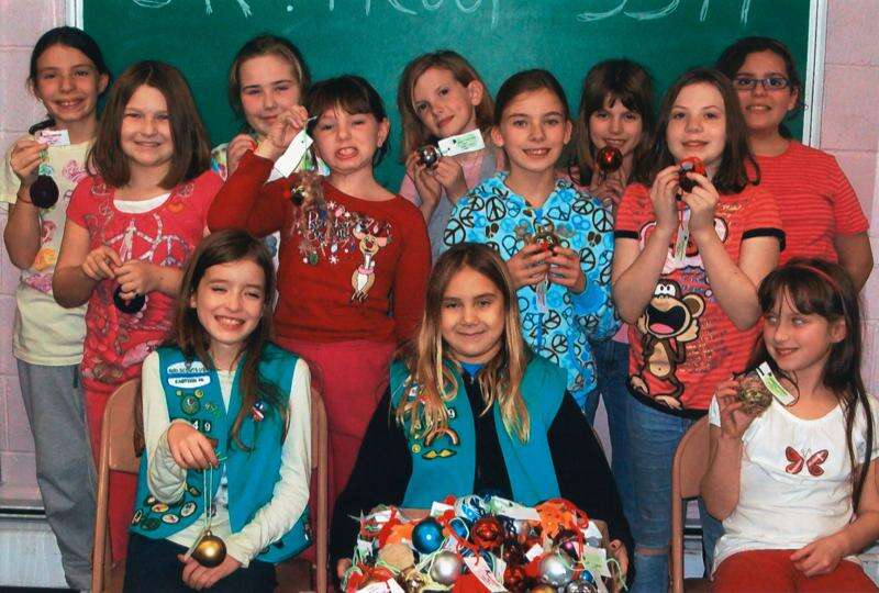 Lehighton Girl Scout Troop 3349 had plenty of Christmas spirit as they made ornaments for the residents of The Summit, Blue Mountain Health System nursing home, Lehighton. Taking part in the presentation of ornaments were, from left, front row, Shannon Beltz, Destiny Moser and Amanda Steigerwalt; second row, Alivia Paules, Amanda Yoder, Lisa Gabory and Alexandra Rehnert; and third row, Emily Haberman, Steph Reph, Sarah Bradley, Calina Boni and Felicia-Sue Anthony. Leaders are Sheena Beltz, Sue Anthony and Stephanie Rehnert.
