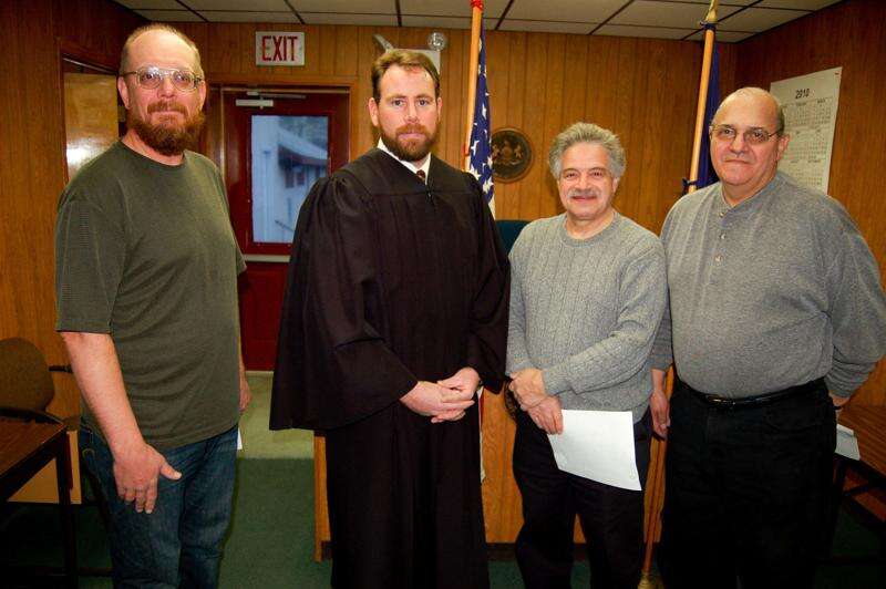 Tamaqua Magisterial District Justice Steve Bayer administed the oath of office to newly elected officials for Kline Township on Wednesday. From left are Leo J. Skotek, auditor; Magistrate Bayer; Carmen Cara, supervisor; and Michael Notero, tax collector.