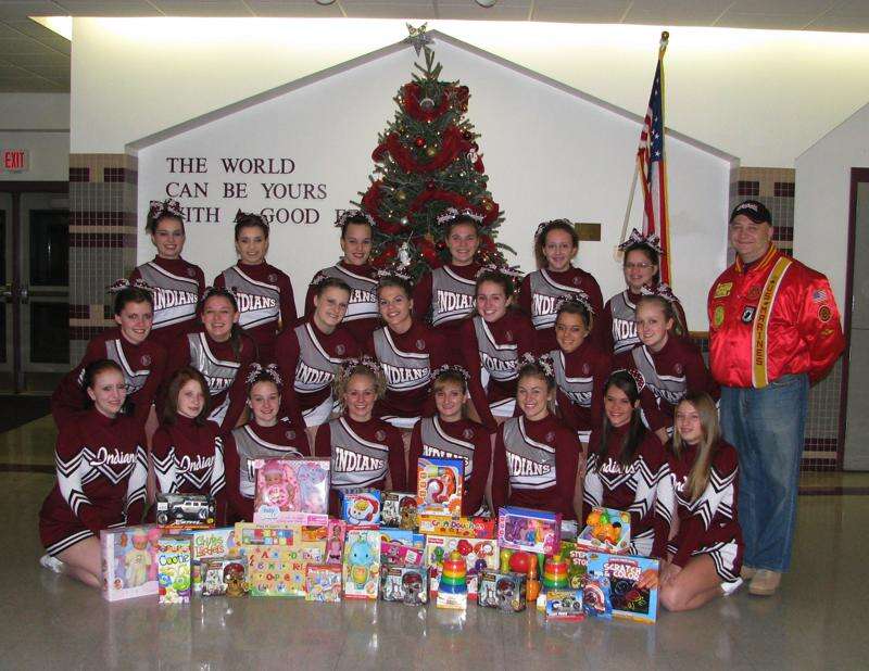 The Lehighton Indians Cheerleaders collected donations for the Schuylkill Carbon Marine Corps League Toys For Tots drive. Pictured with some of their donations are, first row from, left Tynesha Schaeffer, Marissa Michalik, Sarah Pickerin, Carrie Sobeck, Jennifer Everett, Dacin Kemmerer, Cassie Rivera and Tori Kunkle. Second row , Liz James, Megan Turpin, Liz Kamowski, Catherine Varley, Jordyn Miller, Jessica Warnkin and Rebecca Hoffner. Third row, Haley Sawyer, Jenny Barth, Stacey Kerschner, Krysten Breiner, Sydney Schafer, and Lauren Sherry.