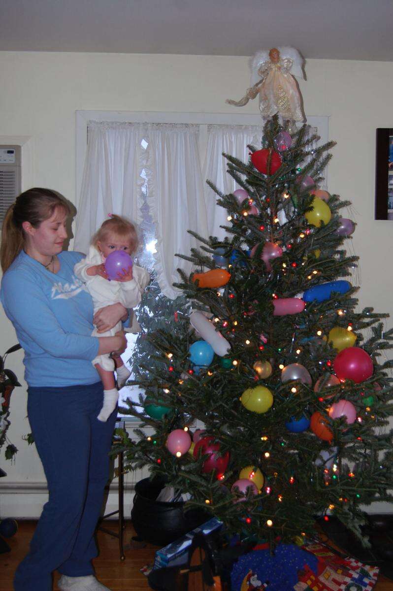 When Lorrie Cockrellof TowamensingTownship was 23she was sittingwatching "GoodMorning America"when a suggestionwas made for aNew Year's tree.Ever since, afterChristmas her treeis loaded with blownballoons andchildren are invitedto take them andpop them - frequentlyby rubbing themon the tree needles.It became a Cockrelltradition. Lookingat the tree is JaclynBartholomewof Palmerton held by Samantha Cockrell.