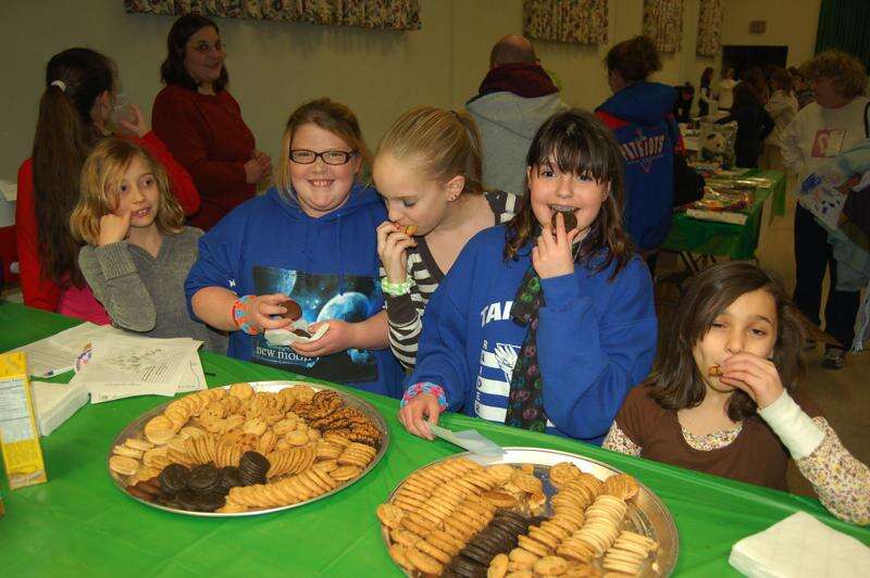 www.FindCookiesNow.org. From left, scouts Sarah Maue, Madison Watson, Rachael Paisley, JulieAnn Koscak and Ashley DeAngelo dig into a plate of cookies.