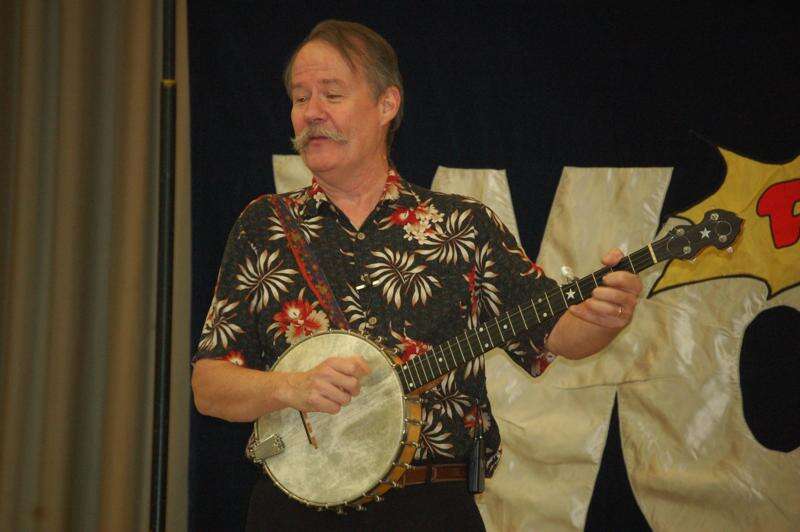 Folksinger and storyteller Bill Wellington performs his Radio WOOF (World of Folklore) program for students of Tamaqua and Rush Elementary Schools during a Raider Rules Awards Assembly at Tamaqua Elementary on Jan. 21. Wellington, who resides in Staunton, Virginia, played fiddle, banjo and acoustic guitar and entertained the students with stories, folk songs and jokes. Wellington also performed at West Penn Elementary School on Jan. 20 and gave a Family Night concert at the Tamaqua Area Auditorium.