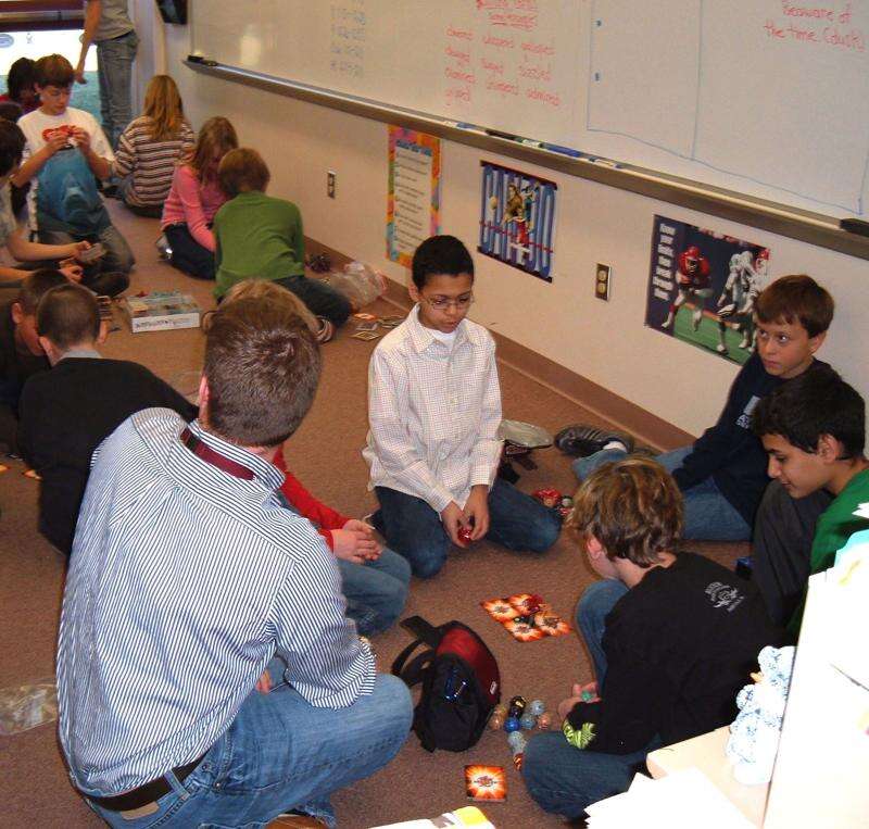 DAVID WARGO/SPECIAL TO THE TIMES NEWS Jacob Molchany (left, head turned) sits with students in the Bakugan club as they duel during the Lehighton Area Middle School's club period held on alternate Fridays. The club is just one of 41 selections students have during the activity period for this year.