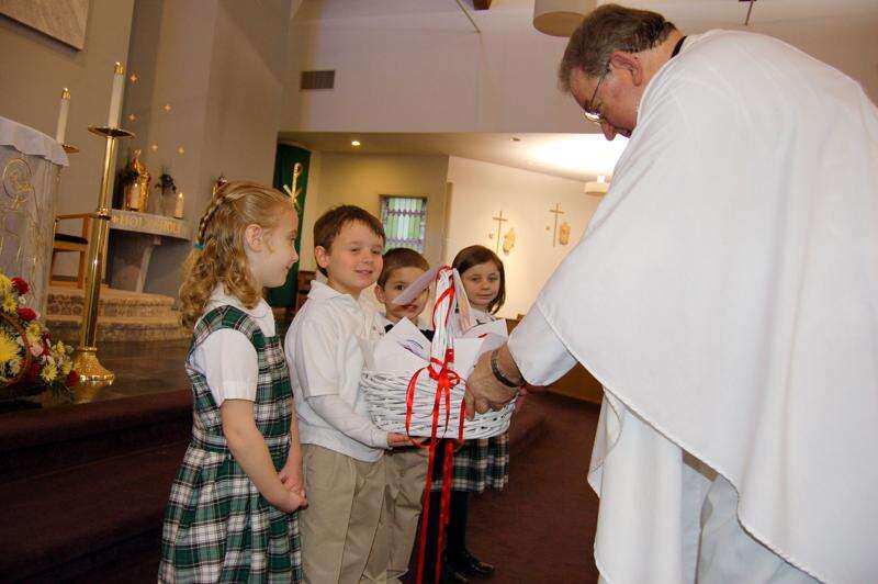 Kindergarten students [l-r) Madison Mahler, Christopher Ross, Matthew Chambliss and Sydney Duke from St. John Neumann Regional School's Slatington campus present a basket of prayer hearts to Father Joseph Grembocki at offertory during the Wednesday Morning Mass at Assumption BVM Church in Slatington as part of their donation drive and prayers for the Haitians.
