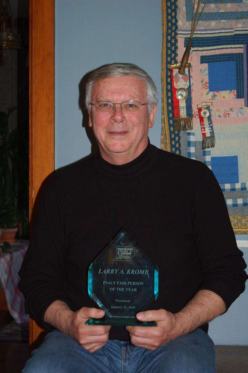 He was sitting at a table with is wife of 46 years, Pat, and some friends, at the Pennsylvania State Association of County Fairs' state convention banquet in Hershey. He was listening to what the speaker was saying about the person who was going to be named as the state's Fair Person of the Year. When he heard that the winner was the past president of the PSACF in 2007 and 2008, he remembers thinking, "Hey, I was president in 2007 and 2008."He turned to Pat and said, "I think he's talking about me."By the time his name was officially announced and he was asked to come forward to accept the prestigious award, he was speechless."They got me good. It really caught me off guard," he says. "And I admit, I got teary-eyed."When he finally found his voice, he says he thanked the fair board and the whole state of Pennsylvania."I've been fortunate to have good people around me and I got to work with good people throughout the state that have helped me and supported me. I also thanked Pat, too, because she's been the wind beneath my wings," he said.Pat had been informed a few weeks before the banquet so she was able to tell their three children and four grandchildren in case they wanted to be there. Unknown to Larry, their son Steve Krome and his wife, Terrie, along with their children, Garrett and Allison, and their daughter, Elizabeth Krome, sat at a table out of his view, watching their dad and grandfather being recognized for his years of service dedication to the fairs of the state. Their daughter, Kristine Berry and her family live in Colorado and could not be present but he spoke to them immediately after the dinner by phone.Larry began his fair "career" as a kid, helping his grandmother with judging and in the kitchen at the West End Fair in Gilbert, which will celebrate its 89th year in 2010 and is one of the 10 most-visited of the 116 county fairs in the state."It gets in your blood," he said.Larry currently serves as a fair director, a position he was elected to in 1961 and has held for the last 39 years. His fair resume includes chairing fair committees on all levels at one time or another, serving as the fair's vice president for 25 years, fair secretary for 12 years and assistant secretary for four years.Because of his love of county fairs, Larry became very heavily involved with the Pennsylvania State Association of County Fairs organization. He has served as: PSACF Round Tables chairperson; PSACF By-laws chairperson; PSACF Resolution chairperson; PSACF Budget Committee chairperson; PSACF Zone II chairperson for eight years and visited every fair in Zone II; PSACF 2nd vice president in 1985; PSACF Executive Committee Member for 25 years; PSACF vice president for 2005 and 2006; PSACF president in 2007 and 2008; Round Table Leader of the International Association of Fairs and Expositions (IAFE) Zone/National Conventions, and has written articles for the PSACF and IAFE. He is currently serving as a past-president and sits on the PSACF Advisory Board.Larry and Pat attend at least 30 state fairs a year.He believes his dedication to the fair comes from growing up with it and it being a family tradition. When he and Pat got married, she became hooked, too and served as a fair director until just recently.Larry was nominated by four county fairs for Fair Person of the Year: West End Fair, Pike County Fair, Wayne County Fair and the Bloomsburg Fair.Lee Robinson, past president of PSACF and chairman of the Fair Person of the Year committee, says that they look for someone who has been heavily involved in his or her local fair for a number of years and involved in PSACF."Larry qualified in all those areas making him a prime candidate," says Robinson. "He worked very hard with us when our Department of Agriculture funding of $4.4 million got cut to $2 million, doing a lot of lobbying for more funding, which is so helpful to the smaller fairs." (The fairs are very important in promoting agriculture.)Larry graduated from Chestnuthill High School, Churchman's Business College and General Motors Accounting School. He was employed for several years at the family business of Krome Chevrolet and he retired from the United States Postal Service in 2003. He has been active in other organizations in his community throughout his life. He admits, being named Fair Person of the Year is a very high honor for him."When I became president of PSACF, that was more than I ever thought I'd see. But getting Fair Person of the Year? Well, that's the pinnacle. It doesn't get any better than that," said Larry.