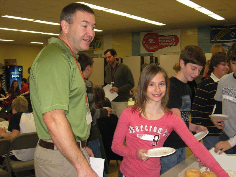 STACEY SOLT/SPECIAL TO THE TIMES NEWS Seventh grader Jenifer Beers, right, chooses a doughnut during Lehighton Area Middle School's B.O.S.S. program. With her is Timothy Sharrow, the school's physical education instructor, who nominated Beers for the program.