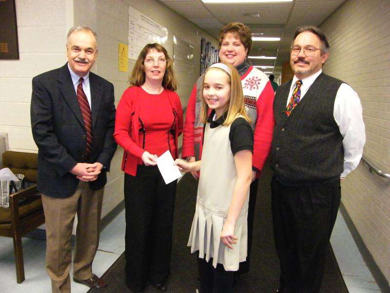 CAROL ZICKLER/SPECIAL TO THE TIMES NEWS Zoe Arnold, fourth grade student at Panther Valley Elementary School presents a check for $1,774,30 to Sharon Kendig, manager of the American Red Cross Carbon County branch for the grief stricken victims in Haiti. Looking on approvingly are from left, Dr. Robert Mauro, PVHS interim principal; Lisa Mace, PVMS principal; and William Lombardo, PVES principal.