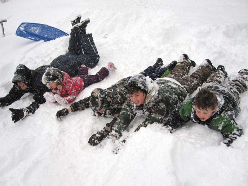 Many families and children took advantage of the fun benefits that almost two feet of snow offers. Pictured belly sledding in Tamaqua, from left, are parent Jason Hulko, Emily Hulko, 4, Caleb Jennings, 8, Aaron Raeder, 11, and Shane Paisley, 10.