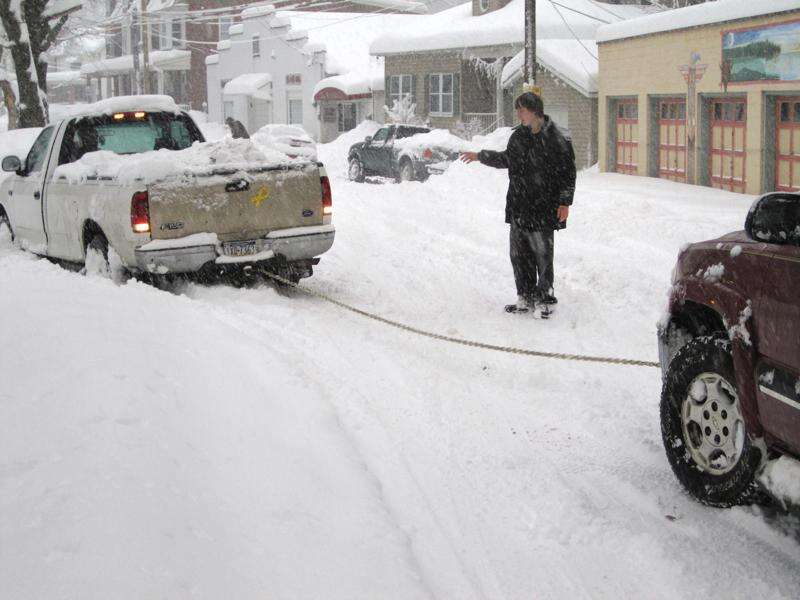 If you had to travel yesterday, you probably found yourself stuck at least once. The unexpected kindness of a good Samaritans is also a blessing. Pictured is a good Samaritan on Schuylkill Avenue in Tamaqua helping a fellow neighbor by attaching chains to his truck to pull the driver's truck our from a nasty spot.