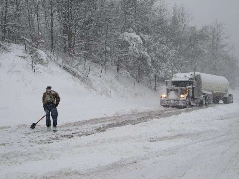 Many tractor trailers jackknifed or got stuck on slick snow covered roads throughout our area. At one time, five tractor trailers were stuck on the "mile hill" located passed Hometown on SR-309 north. State Police had to control traffic while Hopes Towing of Tamaqua had the challenging job of freeing all the tractor trailers from the slick hill. Most of these truckers had no where to park or travel due to the closing of I-81 and unavailability of snow-free parking. Reportedly, SR-309 north was closed for the duration. Pictured is a tractor trailer driver trying to free his stuck truck from the slick "mile hill."