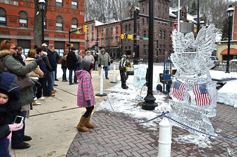 In the dead of winter, under a blanket of white, the historic center of the town was as alive as ever for the festival, as multitudes of visitors strolled Broadway and Race Street, and shopped the town, visited the galleries, and dined in the restaurants, from the train station to the opera house and beyond.There was something for everyone, including ice carving demonstrations, Civil War reenactors, horse-drawn carriage rides, strolling musicians, the Jim Thorpe Mug Walk, and in the evenings, live entertainment at the Mauch Chunk Opera House.Chamber member Dan Hugos, reflecting the comments of other merchants, said that in spite of the downside of the recent weather, business was good in town. In fact, most shops did as well on Saturday alone as they did over the entire weekend last year.He noted that Winterfest is an important fundraiser for the chamber and said that over the weekend the restaurants were full and businesses were busy with visitors who were enjoying themselves during their visit to the town.One activity that drew much attention was the ice carving demonstrations at Josiah White Park and at the opera house.Ice sculptor Neil Trimper of Sculpted Ice Works from Lakeville, near Lake Wallenpaupack, answered questions from the crowd and gave an entertaining and detailed description of the techniques and procedures involved in sculpting the large blocks of ice.Each block of ice weighs about 275 pounds and is 20 inches by 40 inches by 10 inches thick and is produced by Sculpted Ice Works themselves.When asked what holds these huge blocks of ice together when stacked for carving, Trimper calls it "ice glue," better known to many as "water" which, when squirted onto the blocks of ice, freezes securely, bonding them together.Also drawing a lot of interest was a visit by the Civil War reenactors of the 69th Pennsylvania Irish Volunteers who put on a living-history display both days.The 69th was the only Pennsylvania regiment to carry the green Irish flag into battle. This battle flag was given to the regiment by the people of the city of Philadelphia.The regiment was recruited from Philadelphia Irish militia companies of the 2nd Regiment, Pennsylvania Militia and was mustered into service on Aug. 19, 1861.The regiment's first action was at the Battle of Balls Bluff. The 69th served in the Peninsula Campaign, during which it was complimented by Major Gen. Joseph Hooker for making "the first successful bayonet charge of the war."The unit played a large role at the Battle of Gettysburg, helping repel both Brig. Gen. Ambrose Wright's charge on July 2 and Pickett's Charge on July 3. Its casualties over the last two days of the battle were enormous, losing 143 men out of 258, including its colonel, lieutenant colonel, two captains and a lieutenant.The regiment's ranking officer, Major Duffy, was seriously wounded but refused to give up command until the battle was over. The 69th finished the campaign under the command of a captain.This and other related information is available on their Web site at