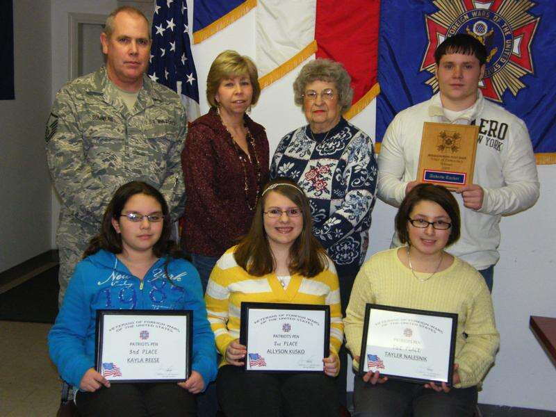 The Nesquehoning VFW Post 8008 and its Ladies Auxiliarypresented numerous awards to Panther Valley School District recipients recently. Front row are Patriotic Pen Award winners Kayla Reese, third place; Allyson Kusko, second place; and Tayler Nalesnik, first place. Standing are VFW commander Brian Sommers, his wife Cathy Sommers, auxiliary president; Tillie Lakata, co-chair person of the entries; and Andrew Tucker, winner of the Voice of Democracy Award. Tucker's entry was entitled "Does America Still Have Heroes" which won him both first places in VFW Post 8008 and the District level.