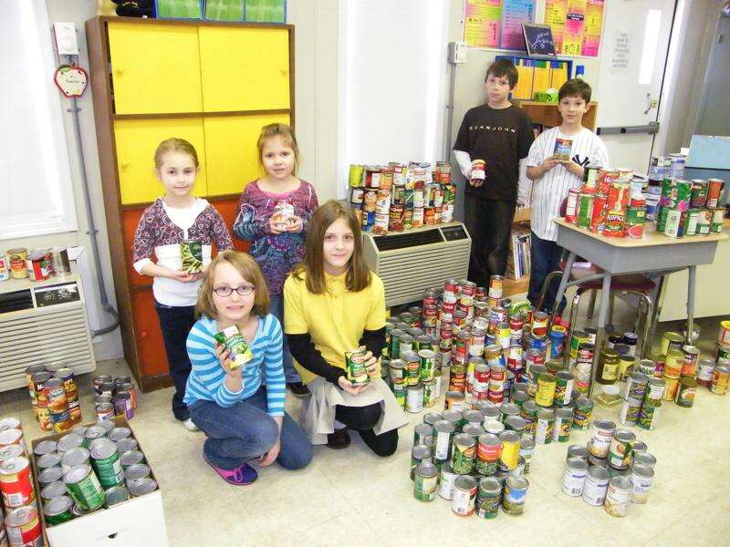 Panther Valley School students from the elementary school and the high school held a dress down day bringing in a can of food or money for the cause. The food and money will be divided amongthe Nesquehoning, Summit Hill, and Lansford-Coaldale food pantries. The total amount of money collected was $675. Checks will be presented to each food pantry for $225. More than 900 cans of food were collected and will be divided. Coordinating the drive was Rick Morgans, a teacher at the high school. Food at the elementary school was stored and divided in Jacqui Morgans classroom giving the children an extra lesson in math. Helping with the arranging of the food are Cheyene Lee-kindergarten, Mackensey Evans-first grade, front row are Angel Stilitino-second grade, and Trisha Biddle-fifth grade. Tyler Baez-fourth grade and Aaron Miller-third grade are standing to the side.