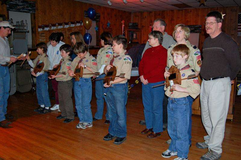 Greg Cope, said scouting is the safest investment you can make in your child's success and explained that it cost $120 for a child per year of scouting. He asked parents to contribute. It is the 100th anniversary of scouting.Jarrett Kleintop gave the invocation.Bill Kmetz, a Webelos leader, said Cub Scouting is a journey with Chief Akela. Chief Akela told the scouts of his father, the Arrow of Light, an arrow that points ever upward. The journey takes them from the Tiger's den, to that of the Wolf and Bear."Our tribe can only be strong when the boys of the tribe are strong," said Kmetz.Ron Borger helped Kmetz lead the program.The Tiger Cubs were invited to the front of the room with their parents. They were: William Drake IV, Jonathan Eckhart and Derek Rea. The mark of the Tiger was painted on their cheeks by Colby Burnett.The Tiger badge was placed on the left shirt pocket upside down, to be righted when they had done a good deed. Tigers also received their Bobcat badges. The Bobcat work is preliminary to moving on into scouting by teaching them the promise, the law of the Pack, and the Cub Scout sign, handshake, motto, and salute.Second graders are in the Wolf Den. They receiveed the Wolf sign on their cheeks and also received their badge which a parent placeed upside down. Members of the Wolf Den are: Austin Ahner, Carson Allen, Michael Burnett, Richard Fasching, Matthew Garambone, Logan Kresge, Joshua Long, John Lundy and Ethan Seipel.After Wolf comes the Bear. The Scouts learn and follow the arrow ever upward. They received the mark of the Bear. Bear Scouts who moved on are: Tanner Burnett, Mason George, Kory Marlatt, Eric Nothstein, Ethan Rotella and Zachary Schoenberger.The next step is Webelo I which helps them move along the trail marked by the Arrow of Light. They are: Jarred Bartholomew, Eric Baumgardt, Brody Boehler, Ryan Borger, Garrett Demkovitz, Nicholas Garambone, Hayden Kresge, Jarrett Long, Colby Moyer, Nathan Sterner, Jacob Taschler and Stephen Zazulak.Webelos II Scouts are eligible for the Arrow of Light. They earned eight activity pins and participated in an overnight camp or day hike.They have taken part in an outdoor activity with a Boy Scout Troop.As they completed the Cub Scout trail, they received their Arrow of Light badge and a plaque with an arrow. These Scouts are ready for Boy Scouting: Alexander Bortz, Cole George, Brian Henry, Andrew Kmetz and Joshua Ritter."This is a significant achievement. The Arrow of Light badge can be worn as a Boy Scout. It was a challenge to reach the highest rank. You've shown what you can do. I challenge you to continue the ideals you learned in Cubs."Think of the Arrow of Light and what it means. The seven rays of the sun (on the plaque) are a reminder to do your best every day. The arrow is straight and true like you should be. Congratulations and good luck," said Kmetz.He asked the audience to give the Scouts a standing ovation for earning the highest award in Cub Scouting.The boys crossed the bridge into Boy Scouting and were met by members of Troop 209 who gave them new colors and a tie, welcoming them into the troop.They joined the Boy Scouts around a "campfire" at the camp set up on the stage.Recognizing the people who keep Pack 209 running, the adults were called to the front: Greg and Debbie Cope, Melodie Ritter and Steph Kresge, committee chairpersons; Connie Bartholomew, secretary; Steph Demkovitz, advancement chairperson; Mike Garambone and Angela Rotella, treasurer; Steph Krege, committee member; and Connie Bartholomew, secretary. Cubmaster Rick Moyer was absent.Den leaders are: Jamie Drake, Tiger; Colby Burnett and Mick Ahner, Wolf; Angela Rotella, Linda Marlatt and Cinda Nothstein, Bear; Rocky Borger, Steph Krege and Scott Long, Webelos I and Bill and Mariann Kmetz, Webelos II.The adults received quart jars filled with $100,000 Grand candy bars "because that is what they are worth" and a CD with the photos that were shown before the program. Mariann and Bill Kmetz received a gift certificate so they "can go out and enjoy themselves."Asked what she will be doing after her many years in Girl Scouts and Cubs, Mariann said they will probably help with the Boy Scouts.Several positions have opened in Cub Scouting and volunteers are needed.