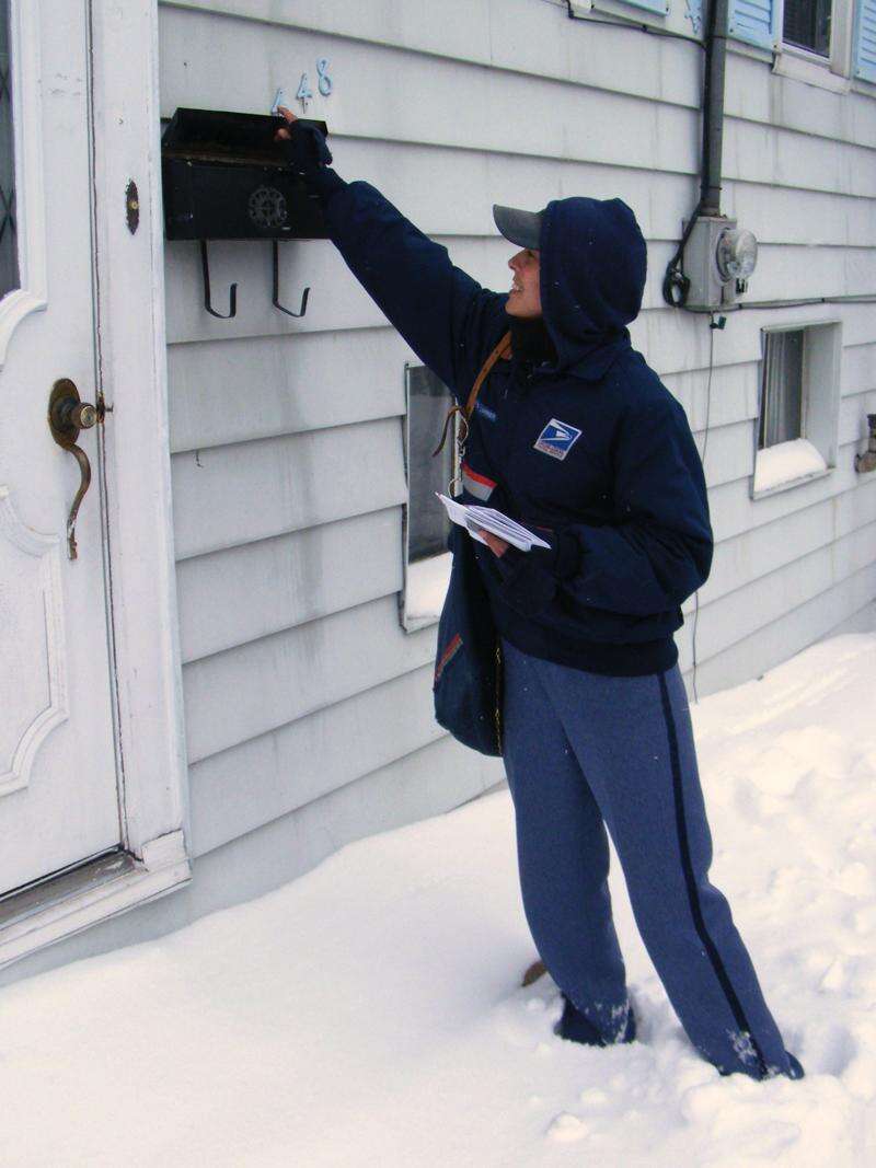 Although last week's snowstorm halted mail delivery in many area communities for one day, everything was back on schedule by the weekend. Pictured delivering mail Saturday in the snow is Michele Strasser, a Tamaqua Post Office carrier.
