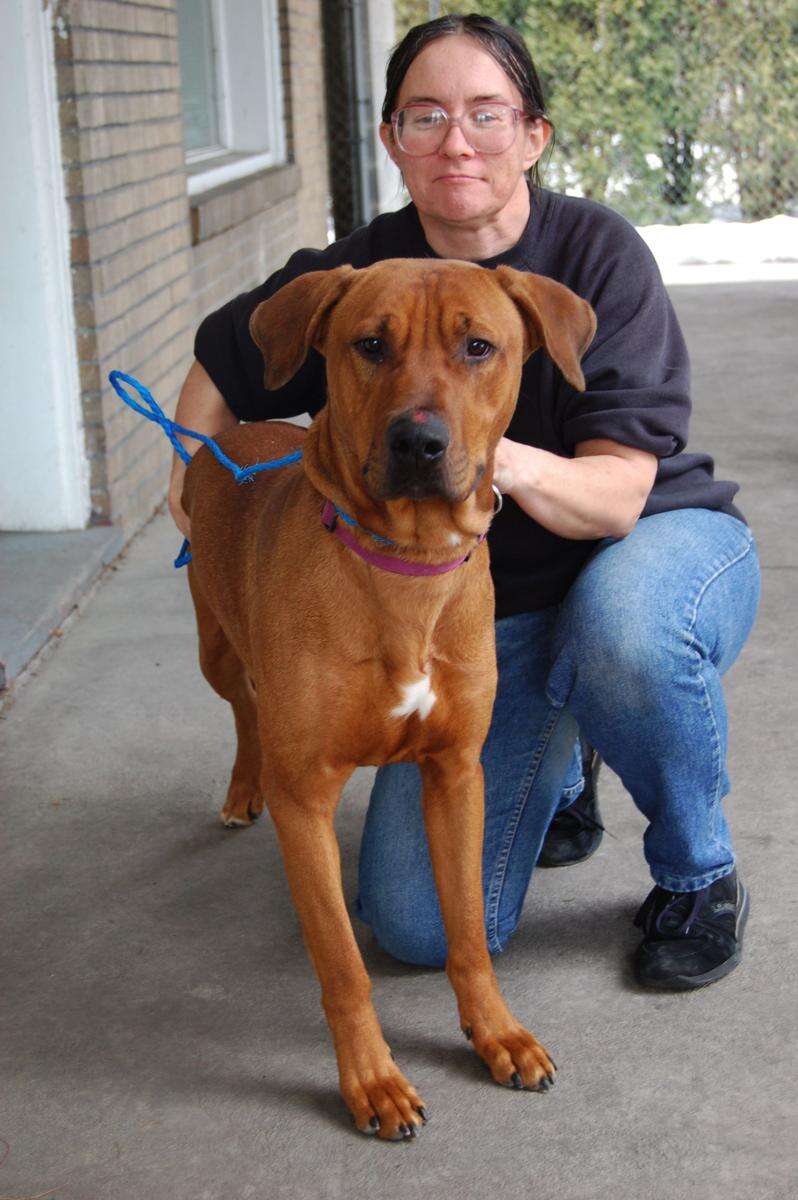 Chase, a male neutered Rhodesian Ridgeback mix, is available for adoption at the St. Francis Animal Hospital. The dog is approximately 1 to 3 years old. He is up to date with his vaccines and friendly. He would do better in a one dog family. He is shy and not aggressive. He is a rather large dog weighing approximately 80 pounds. Chase is shown with Joann Davenport, an employee of the St. Francis Animal Hospital. Anyone seeking to more information or to adopt Chase should call Angie at (610) 377-5574.