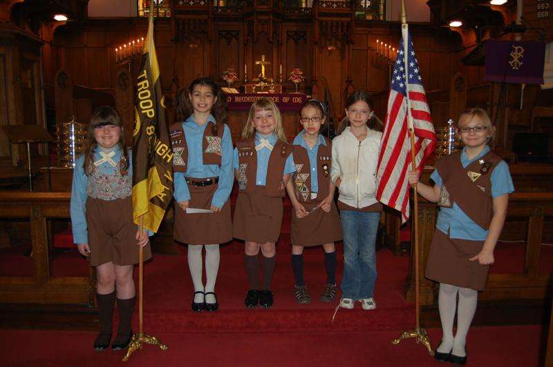 Lehighton Girl Scouts celebrated Girl Scout Sunday during services held at Zion United Church of Christ, Second and Iron streets, Lehighton. From left are, Jessica Kellner, Olivia Rodriguez, Amber Curran, Allison Steigerwalt, Taylor Carroll and Maria Burits. Opening ceremonies were presented by Senior Girl Scout Troop 3583, Cadette Troop 3801 and Brownie Troop 3862. Thinking Day activities followed in the Fellowship Hall. The girls presented foods and customs of the following countries, Thailand, Germany, Italy, United States, Philippines and China.