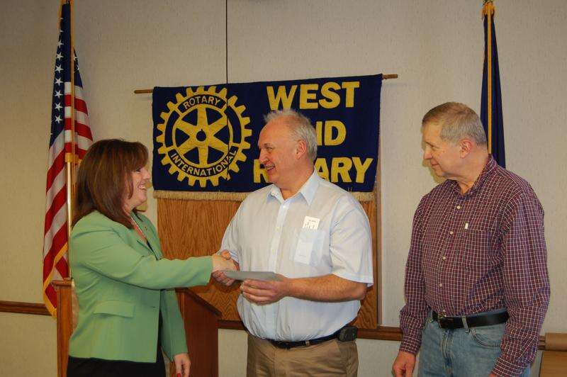 Leon Frable, Assistant Fire Chief and Terry Van Buskirk, Treasurer of the Kunkletown Vol. Fire Co. (KFC) accepts a check for $2,000 from Theresa Yocum, president of the West End Rotary Club. The WERC held a Longaberger Basket Bingo and the proceeds are being distributed throughout the West End Community which included the KFC. Frable said Kunkletown will put the money toward a new sign to display events at the firehouse. "On behalf of the Kunkletown Volunteer Fire Company, we greatly appreciate this. The fire company volunteers and our ladies auxiliary, who are great in helping us with all our fund raisers from Bingo to the carnival to our stand at the West End Fair, thank you. Fund raising puts a lot of burden on the community, so we are grateful for this donation," said Frable.