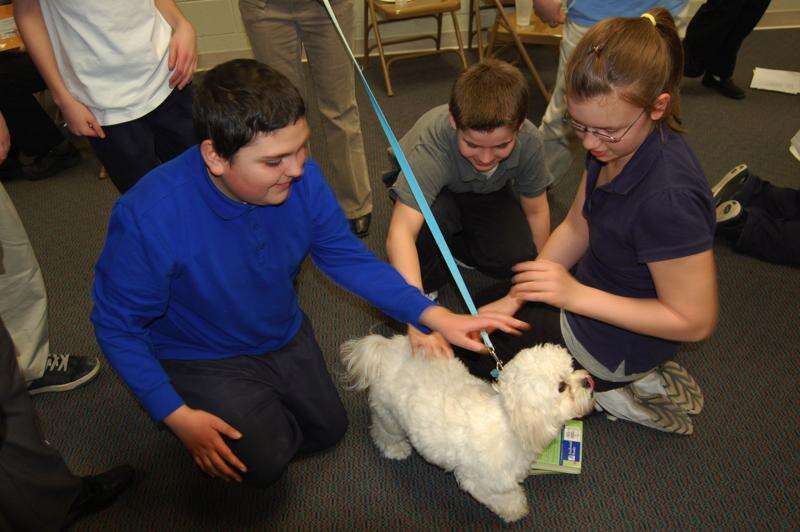 LINDA KOEHLER/TIMES NEWS Joey, a Waggin' Tails Animal Shelter of Kresgeville success story, spends time getting acquainted with some Pleasant Valley Intermediate School students at a recent assembly. A few slurpy licks was his way of saying "Thanks" to the children for all their donations which will help some of his furry friends stay safe and well-fed until they can be adopted, too.