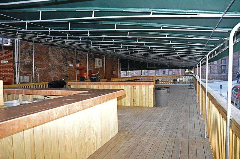 The new deck located next to Molly Maguires Pub & Steakhouse on Hazard Square in Historic Downtown Jim Thorpe has just gone under the cover of a large canopy as final preparations have been completed for it to be opening at 11 a.m. for Sunday's St. Patrick's Day parade in the County seat community.At 80-by-30 feet in size, this spacious facility has an area of 2,200 square feet which features, among other things, a large outdoor full-bar and a side-bar with tile bar tops and eventual seating for about 90 to 100 people who want to dine there when it goes into full operation.The full-bar will accommodate 20 seats and has 18 taps featuring foreign, domestic, craft, and rotating seasonal beers while the side-bar has space for another 8 to 12 seats.For the parade on Sunday, there will also be a food station with soft pretzels, hot dogs, chicken fingers, soup, and chili available.The formal Grand Opening of the deck will be held about the third week in April and will then feature full-restaurant dining.Until the grand opening in April, the deck will be open on weekends depending on the weather.Planned operating hours will range from 11 a.m. to noon for opening times until about 8 or 9 p.m. for closing, depending on the weather and the season.In the event of inclement weather, the deck will also have side curtains that will roll down and are transparent so as not to restrict the view.This family-friendly, handicap-accessible facility is expected to be open 8 to 9 months out of the year and will accommodate banquets, private parties, showers, weddings of up to 90 or 100 people.Now customers can relax in an outdoor atmosphere with a view of mountains, mansions, trains and more as the seasons roll on by.