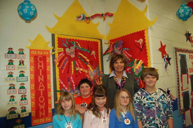 Mrs. Smith, Learning Support teacher for K-5, at Towamensing Elementary School, and a few of her students, left to right, Allison Haydt, Austin Costenbader, Makayla Fenner, Taylor Weaver, Chucky Burke, admire their handiwork which won them first prize in the Door Contest held during Read Across America week. They based their design on a favorite book they read, "Chinatown" by William Low with the look of pagodas, Chinese lanterns, dragons and pictures of themselves dressed in a kimono and straw hat. For their win, Mrs. Smith's classroom will receive an ice cream party from the PTO. The judges, Mrs. Boyce, Mr. Congdin and Mrs. Vignone, had such a hard time picking one winner out of so many wonderful entries, they gave two more awards for runner ups to Mrs. Morgan's 6th grade class for their "Cat in the Hat" door and to Mrs. Calpas and Mrs. Hard's 3rd grades' shared entry of "The Sneetches" by Dr. Seuss. They will also receive treats from the PTO.