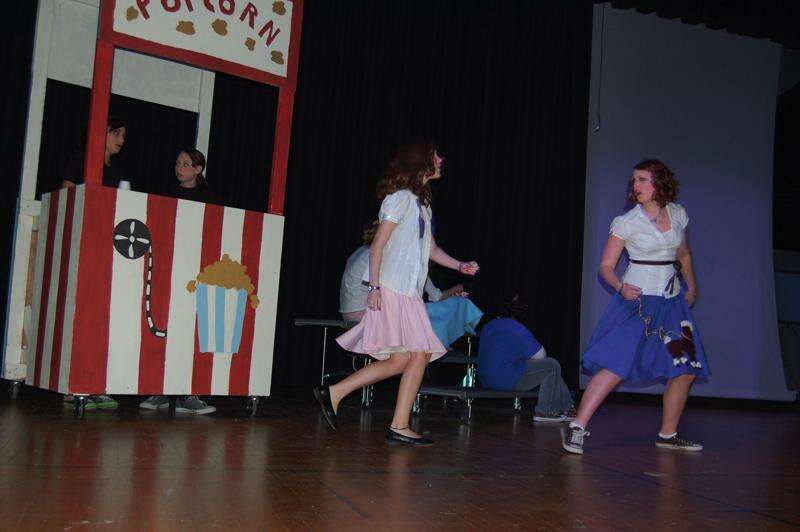 TERRY AHNER/TIMES NEWS These students perform the scene A Chat by the Popcorn Stand during the play "The Outsiders".