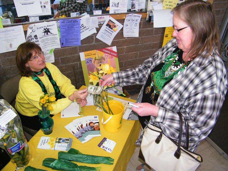 ANDREW LEIBENGUTH/SPECIAL TO THE TIMES NEWS The Carbon-Tamaqua Unit of the American Cancer Society Daffodil Days volunteers will be at various locations throughout our area this week until Saturday taking donations and selling ACS daffodils, Boyd's Bears, and vases. Volunteers will be at the following locations from noon to 6 p.m.: Mallards Market in Lehighton, Jim Thorpe Market, Carbon Plaza Mall, Redner's Warehouse Market in Nesquehoning, and Boyers Food Markets in Tamaqua and Lansford. From 9 a.m. to 3 p.m.: Country Harvest in Palmerton. From noon to 6 p.m.: The Village at Palmerton. Pictured collecting donations from donator Kathleen Brown, right, is Carbon-Tamaqua ACS staff member and Cancer control specialist Judy Hoppes while collecting at the Tamaqua Boyers Market.