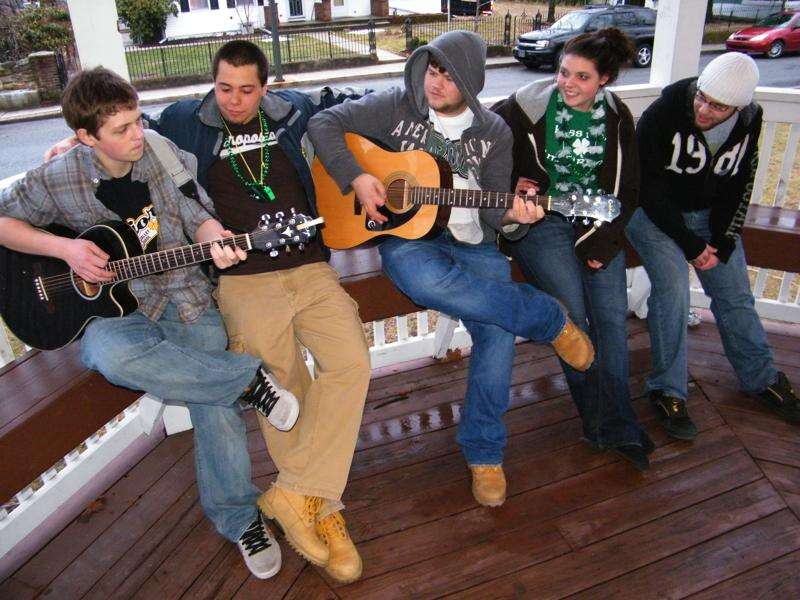 Summit Hill teenagers taking advantage of the lighter rain and slightly warmer temperature Sunday evening while singing and playing Irish songs in the Ludlow Park gazebo located in Summit Hill. Teenagers from left are Justin Hall, Matt Snyder, Chris Field, Haley Tee, and Mark Dietrich.