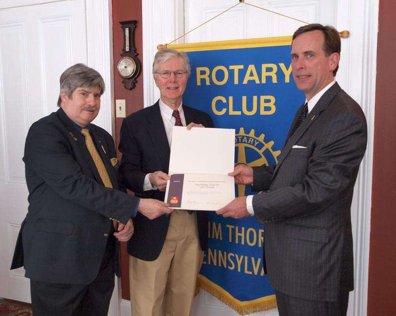 As Ted Silver - district governor of District 7410 of Rotary International looks on, Bill Allison - president of the Jim Thorpe Rotary Club receives a certificate from Gordon Bigelow - chairman of the local Rotary region. The Jim Thorpe Rotary Club raised $2,000 for Rotary International's Polio Plus program to eliminate polio worldwide.