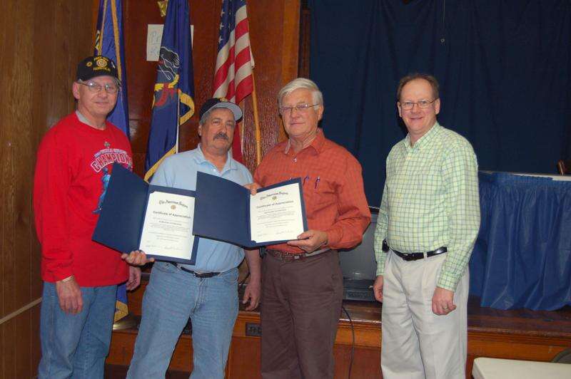 TERRY AHNER/TIMES NEWS Richard Nothstein of Palmerton (second from right) proudly accepts a certificate of appreciation presented to he and his wife, Darlene, for their support to the veterans of Carbon County, from all the veterans organizations in the county. Pictured with Nothstein are Palmerton VFW members Joe Uhnak (first from left), Ed Moyer (second from left) and Bruce Reiner (first from right).