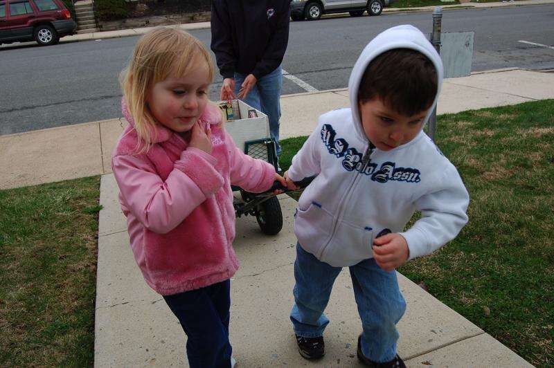 Gail Maholick/TIMES NEWS Trey Sterling and Winter Horner, youngsters at Curious Kids Play and Learn Place, pull a wagon loaded with non perishable food items to the Trinity Food Pantry.