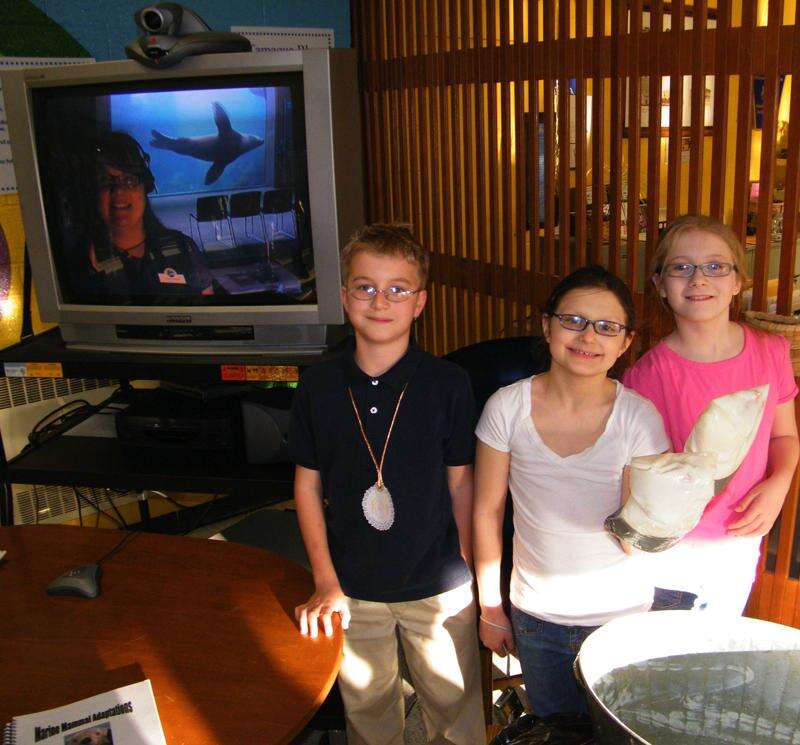 ANDREW LEIBENGUTH/SPECIAL TO THE TIMES NEWS During the Tamaqua Elementary School Science Fair held Wednesday, students show off "blubber gloves" they made from Crisco to teach people more about whale and seal blubber, while also learning more about sea life via a live feed from the Alaskan Sea Life Center sea lion tank located in Alaska. Pictured from left are Alaskan Sea Life Center Education Readiness Coordinator Laurie Stuart (on live TV with swimming sea lion behind her); exhibit presenter Riley McHugh, 10, grade 5; Carley Skinner, 10, 4th grade, wearing blubber gloves; and Shanna Brinkworth, 10, 4th grade, wearing blubber gloves.
