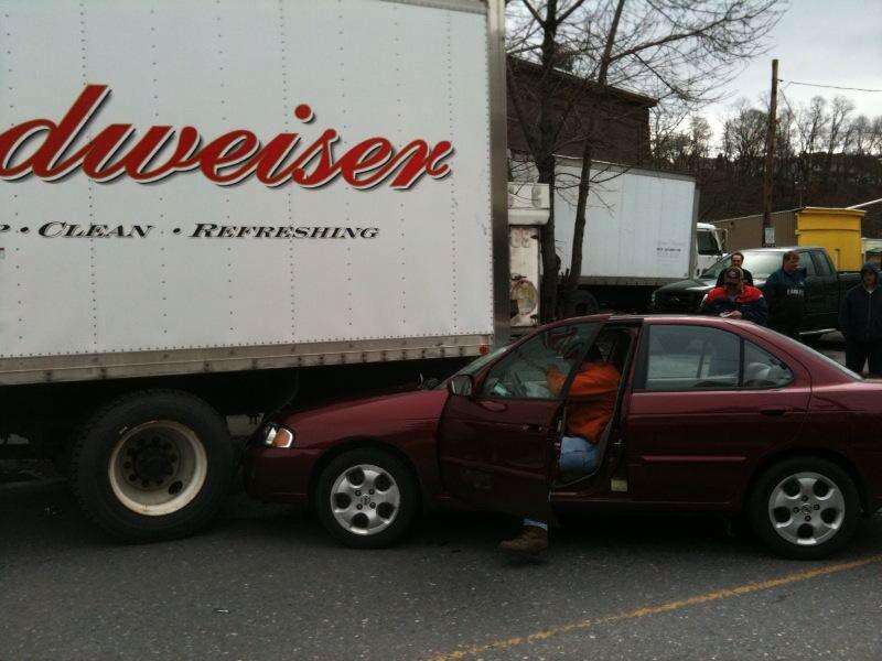 A Tamaqua woman avoided serious injuries Thursday morning when her car struck a parked truck on Pine Street. Patricia Lucyk, of Barnesville, was driving in a red Nissan when she was distracted by a bang from the rear area of the car. By the time she brought her attention back to the front of the car she was unable to avoid striking the rear of a parked truck, owned by Allentown Beverage. The car suffered severe front end damage and was towed from the scene. The truck sustained minor damage.