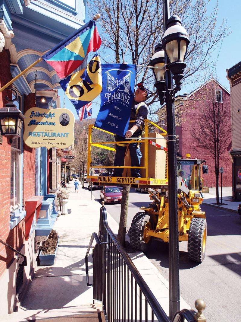 With the warm weather signaling the end of the winter, workers from Jim Thorpe Public Service, Jeff Thomas in the basket with Tom Schafer driving, hang banners on Broadway in the Historic District.