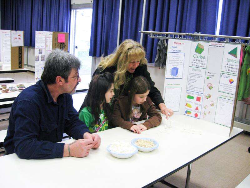 STACEY SOLT/SPECIAL TO THE TIMES NEWS Mike Carrigan, left, explores shapes with his daughter, Lindsay Carrigan, and her friend Haley Neff during "Family Math Night" at Shull-David Elementary in Lehighton. Leading the lesson is instructor Lynne Blymire. Students were asked to recreate shapes, such as a 3-dimensional box or pyramid, using toothpicks and marshmallows. The program was meant to move abstract math concepts out of the textbook and into the hands of students.