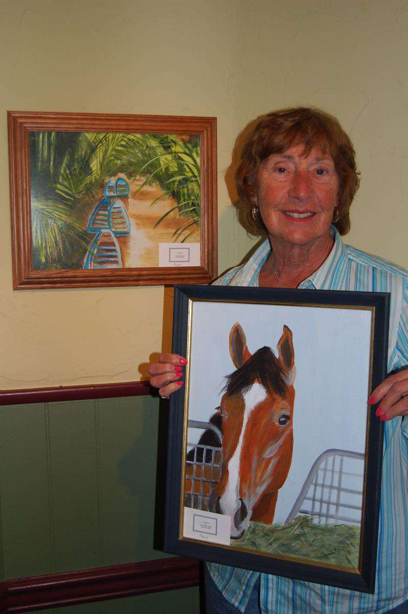 Patricia Smith of McMichaels is the featured West End artist at Hotel Jonas for the month of April. Pat has been painting for over 20 years in oils and acrylics. A retired Pocono Mountain elementary teacher, Pat has more time now for painting and traveling. Many of her paintings are done from pictures she has taken from her adventures in more than 60 countries, like the one hanging on the wall of blue boats on a river in Vietnam, and subjects that interest her, like the one of the horse. She has had her work shown in some local galleries and also in her own "Gallery on the Farm."