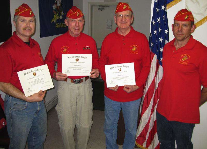 Marines from the Schuylkill Carbon Marine Corps League Detachment 626 received Marine Corps League state awards during their installation of officers held recently at the Nesquehoning VFW. Pictured from left are Schuylkill Carbon Marine Corps League Chaplain Robert Johnson (State Community Service / VAVS Award & the State Distinguished Citizens Award), Past Historian Al Cheese (State Distinguished Citizens Award), Edward Glassic (State Distinguished Citizens Award), and newly installed Detachment 626 Commandant Thomas Fenon.